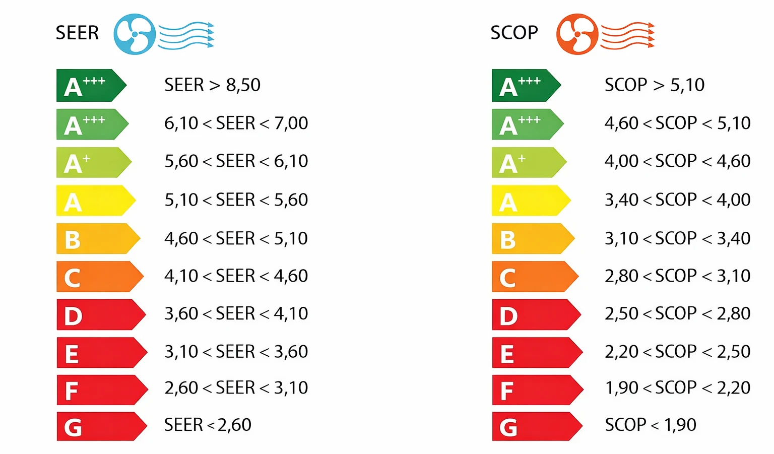 Az inverteres klíma hatékonyságát legjobban a SEER (hűtési) és SCOP (fűtési) érték mutatja. Ezek az értékek minél magasabbak, annál gazdaságosabb a működés.